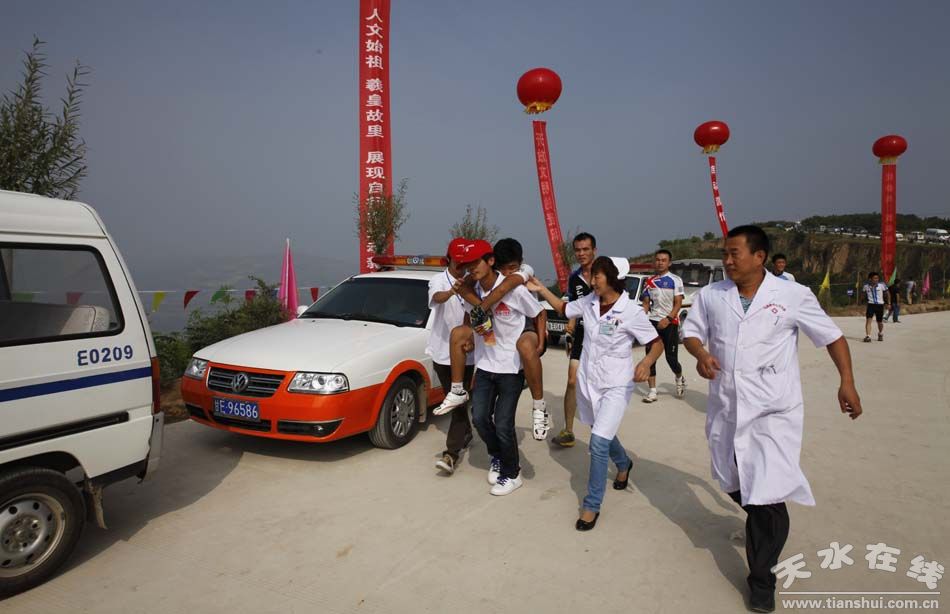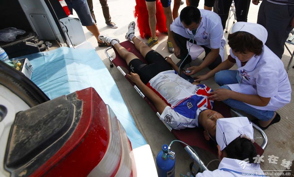 (医务人员对出现体力不支状况的运动员进行现场治疗)