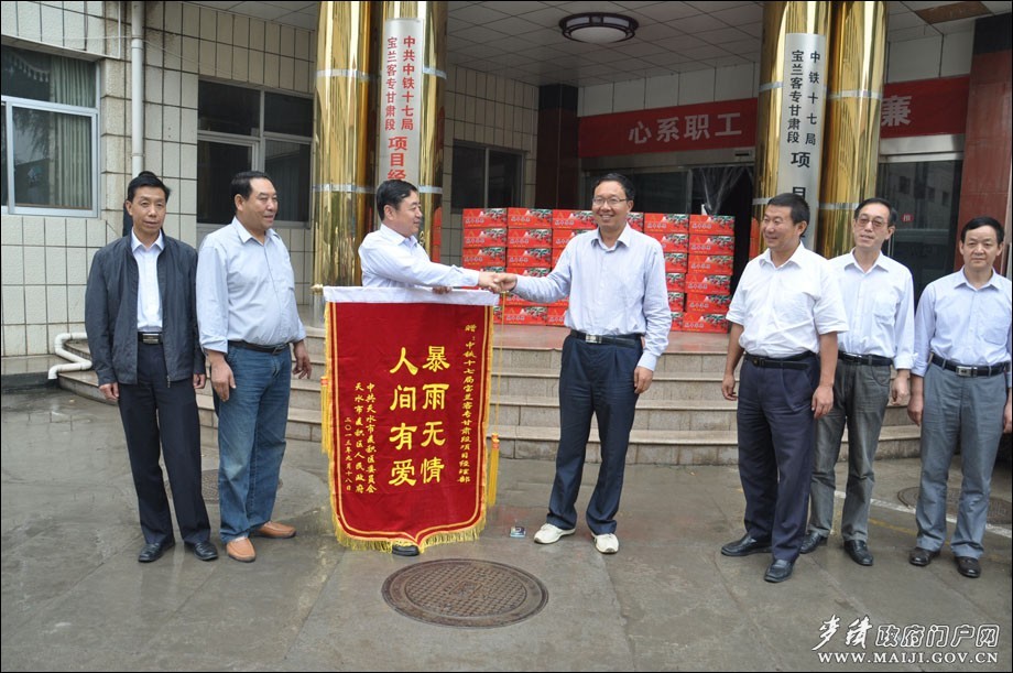 区政协主席杨续祥,区委常委、副区长王彦军一行先后深入中国建筑材料工业地质勘察中心甘肃总队、天水三和数码测绘院和中铁17局宝兰客专项目部进行看望慰问并送上锦旗。杨续祥说,自宝兰客专各项目部施工以来,对于部分乡、村群众提出的一些困难在力所能及的情况下给予了大力的帮助支持,帮助驻地群众解决吃水、架桥等生活困难,特别是在抗洪抢险救灾中,各项目部能想当地党委、政府之所想,急受灾群众之所急,积极投入大量工程机械和人力进行抢险救灾,对于全区抢险救灾工作取得胜利做出了积极的贡献。同时希望各项目部及驻区部队能够一如既往的关心和支持麦积区的各项工作,再立新功、再做贡献。
