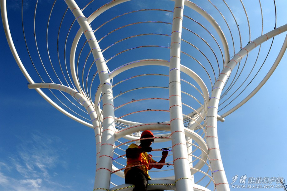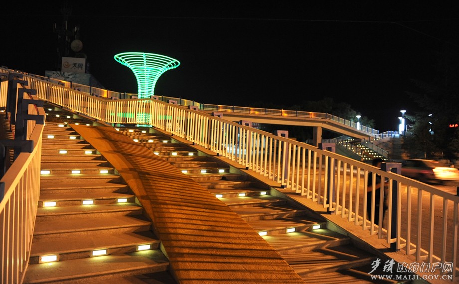盘旋路天桥除了栏杆和桥面得到升级,整个桥体还安装了大量的地灯,转盘中央的环形造型由白色的钢管构建,由下而上呈“涌泉”状,显得大气、美观,充满时尚动感和现代气息。整个造型在夜间闪烁着七彩光环,每当夜幕降临之时,这里的环状转盘雕塑亮起了彩灯,灯光带不断变换着颜色,光圈时而上升,时而旋转,尤其是“麦积欢迎您”的精彩变换,让看到的人都惊叹不已。天桥7个台阶上,每隔两级台阶就装有6盏方形地灯。天桥上沿两侧栏杆的路面,每隔大约2米就有一盏圆形的地面射灯,将桥体装点得格外漂亮。成为麦积区一处新的城市标志景观。