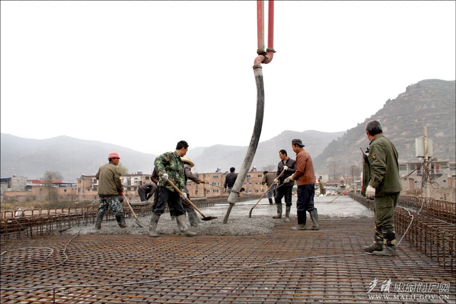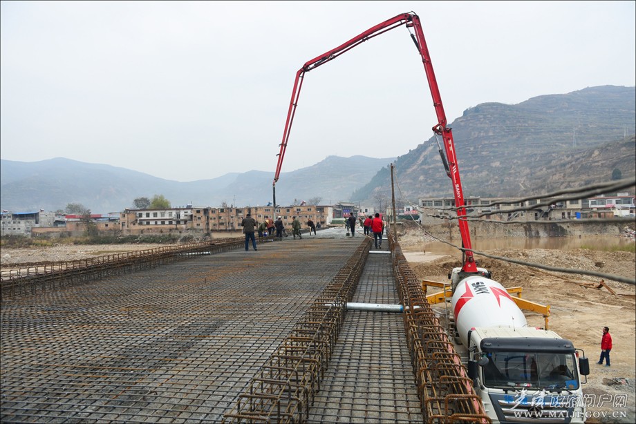 白色商砼车不时开来又开走,红色长臂灌浆机突突向外喷着混凝土,数十名工人分组协作一边浇筑桥面护栏一边振筑罩面……整个工地忙碌有序,建设热度丝毫不减。这是11月21日,小雪节气前一天,笔者重访麦积区伯阳镇兴仁大桥建设现场时看到的景象。