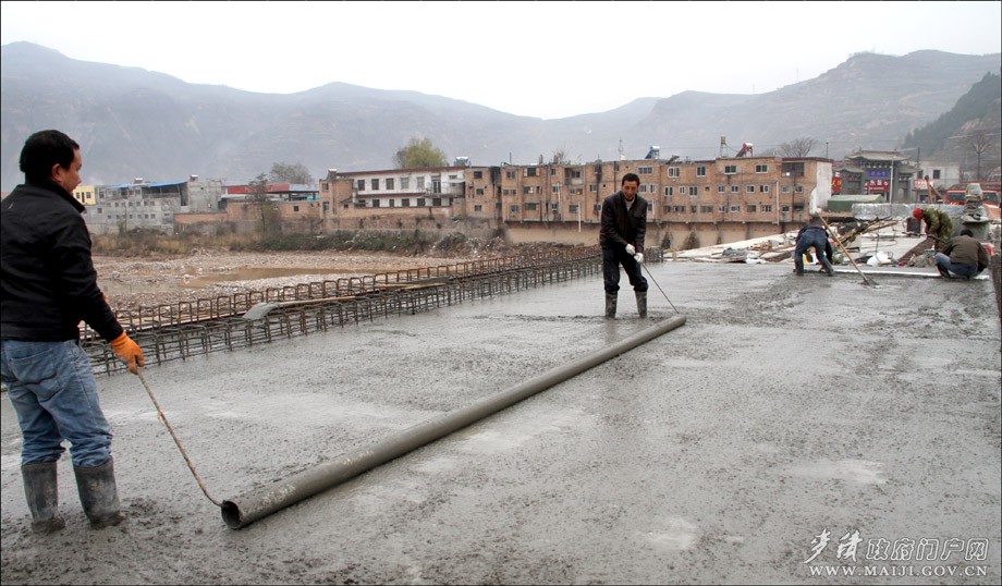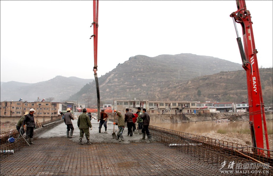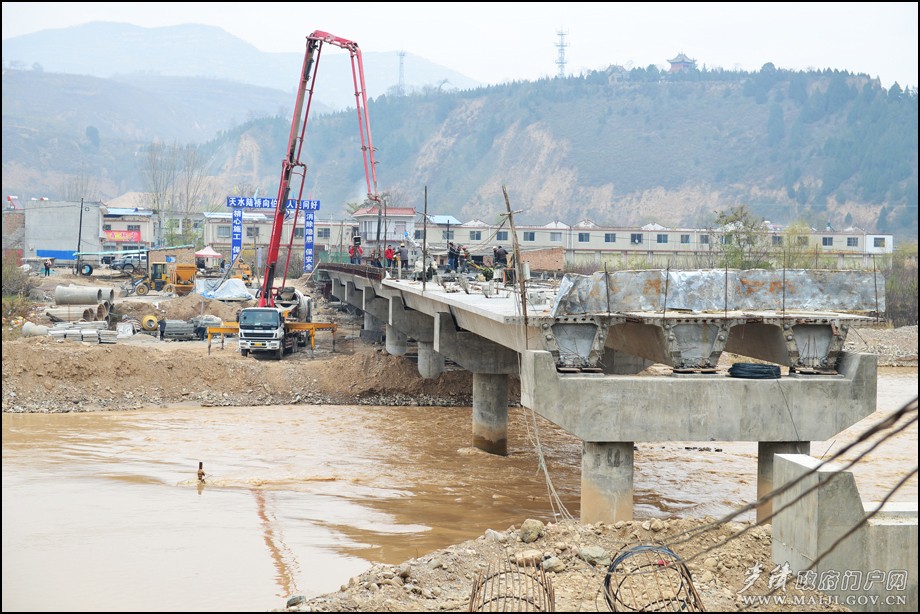 据该负责人介绍,原伯阳镇兴仁村渭河大桥始建于上世纪90年代,属简易便桥,是伯阳镇兴仁、半坡两村及清水县小泉等村群众出行的主要通道。原桥受去年暴洪灾害影响,严重受损,无法正常通行,两岸村民往来、学生上学要绕行至上游3公里外的宝兰客专施工便桥上才能通过。为彻底解决当地群众出行难题,麦积区将伯阳镇兴仁大桥列为全区灾后重建重点交通工程,积极申报项目,广泛筹措资金,及时在原址启动新建了兴仁村渭河大桥。新桥全长166.6m、宽7.5m,总投资逾700万元。目前,已完成总工程量的80%,桩基、立柱和盖梁的浇筑工作全面完成,正在架设桥梁、浇筑桥面,预计今年底可实现大桥合龙,明春将正式通车投用。