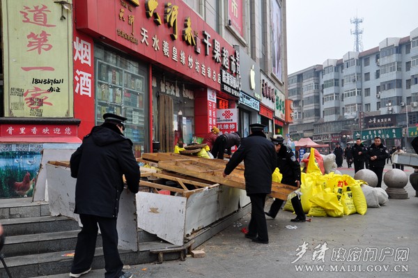 12月26日上午,麦积区城市管理综合行政执法局工作人员来到埠北路与商埠路路口,依法清理了两处长期占道经营的干果店外设摊点。当日下午,兴陇路一家长期占用人行道修车的商铺也在执法人员的监督下搬离。