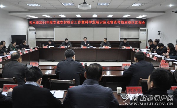 1月12日,天水市副市长霍卫平带领由市政府办公室、市委农工部、市农业局、市林业局、市水务局、市畜牧局、市扶贫办、市供销社等相关部门组成的考核组,对麦积区2014年农业农村综合工作暨科学发展示范点进行了全面督查考核。麦积区委书记张智明,区委副书记吴健,区委常委、副区长王彦军,副区长王亚梅,区政协副主席王启峰等陪同考核检查。
