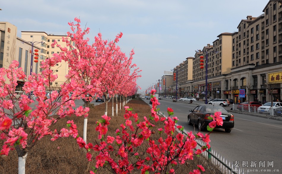 忽如一夜春风来,千树万树“桃花”开。近日,麦积区火车站广场、商埠路步行街东口、道北十字、高速出口和马跑泉中心大道等地,桃红色的绢花将路边树木装扮得鲜艳夺目,吸引不少路人拍照留念,一派喜庆、祥和的节日景象。