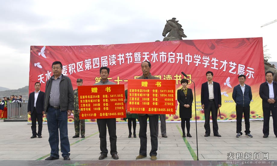 活动现场,麦积区新华书店负责人代表捐赠单位向五龙乡张家湾村、杨王村捐赠图书1131册,总价值18465.60元;区图书馆和天水市启升中学学生表演了具有浓郁“书香味儿”的文艺节目;区图书馆、新华书店、参加活动的其他书商,分别设点布展,现场办理借书证、开展业务咨询、展销优秀图书。
