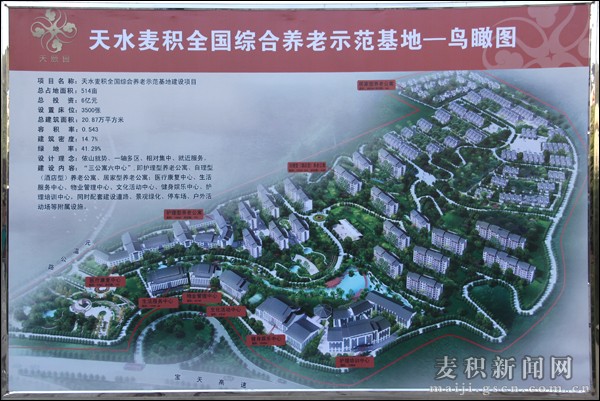 据了解,天水麦积全国综合养老示范基地占地514亩,总投资6亿元,建筑总面积20.87万平方米,设置床位3500张。主要建设内容有“三公寓六中心”,即护理型、酒店型、居家型养老公寓,医疗康复、生活服务、物业管理、文化活动、健身娱乐、护理培训中心。同时配套建设道路、景观绿化、停车场、户外活动等附属设施。工程于2013年3月开工,目前已砌筑围墙、护坡2800米,完成路基工程4.8公里,挖运土方50万方;主体工程于2013年8月启动建设,现医疗护理中心2栋完成主体,1栋完成基础;酒店型养老公寓2栋完成主体,1栋正在2层施工;居家型养老公寓5栋已主体封顶,3栋正在基础施工,完成投资1.4亿元。