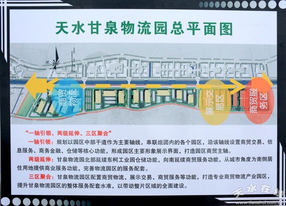 甘泉物流园区项目计划总投资50000万元,建设集物流仓储、配送、信息发布为一体的大型综合园区。温利平要求,要坚持规划引领,高起点定位甘泉物流园区规划和管理运营模式,做好战略定位、发展方向等功能布局和产业发展规划,以产业发展支撑物流园区发展,迅速编制完善项目规划设计方案,突出区位和资源优势,与秦州区藉口物流园区项目协调配合形成优势互补、错位发展的格局。要学习借鉴发达地区物流产业发展的先进经验,从整体上统筹考虑、有序推进,及早开工建设。