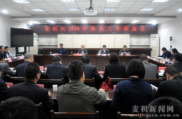 10月25日,麦积区召开2016年涉农工作联席会,认真分析当前农业生产形势,全面安排部署当前农业生产和农业农村重点工作任务,进一步统一思想,强化措施,狠抓落实,确保全年农业增收目标如期实现。