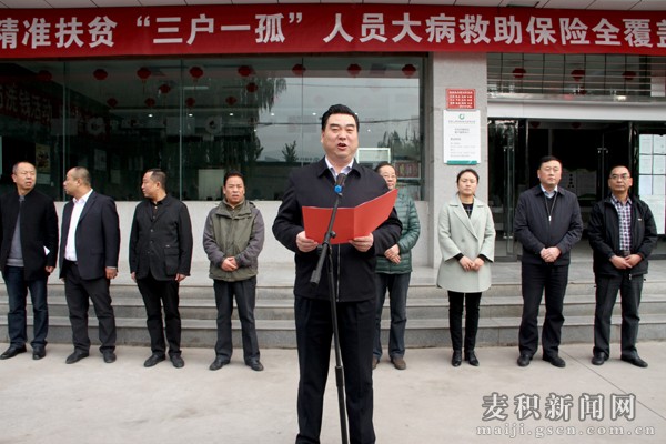 11月4日,麦积区举行精准扶贫“三户一孤”人员大病救助保险全覆盖项目理赔资金发放仪式,标志着全区“三户一孤”人员大病救助保险全覆盖项目进入了全面实施阶段。