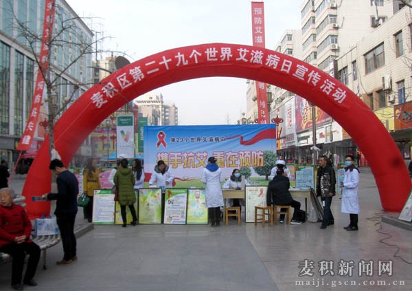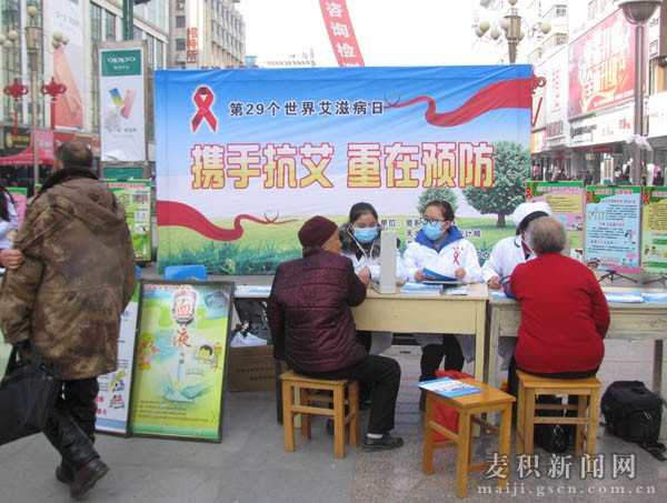12月1日,由麦积区防艾办、疾控中心、团区委及天水市第五人民医等单位联合开展的12.1“世界艾滋病日”宣传活动,在商埠路步行街举行。