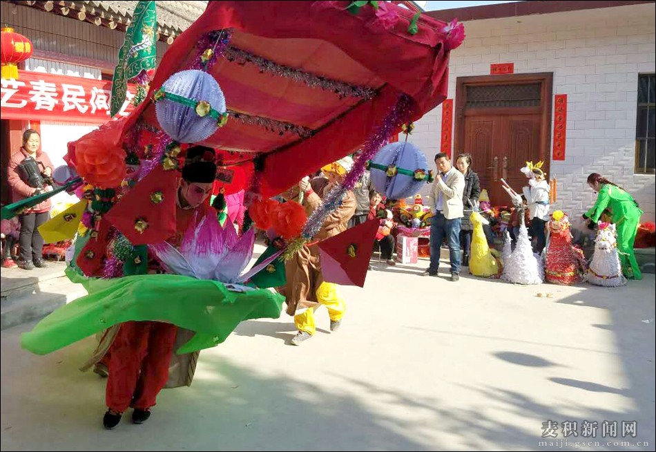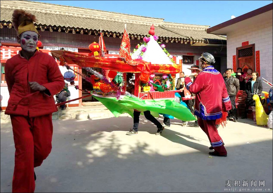 2月12日(农历正月十六),麦积区甘泉镇吴河村红艺春民间艺术团走上村头、走进村民宅院进行民俗表演。