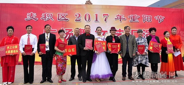 10月27日,麦积区马跑泉市政广场人声鼎沸,热闹非凡,由麦积区民政局、麦积区老龄办举办的2017年麦积区重阳节广场舞文艺汇演精彩上演。来自麦积区老年大学和各健身点舞蹈队的11支舞蹈队表演了23个精彩节目,为全区老人奉献了一台精彩的节日文化盛宴。
