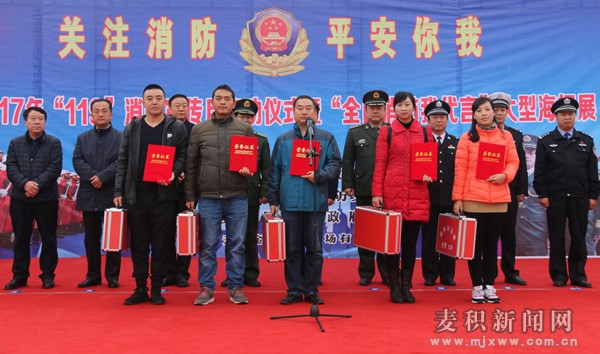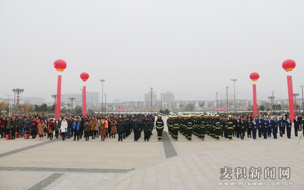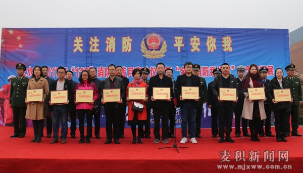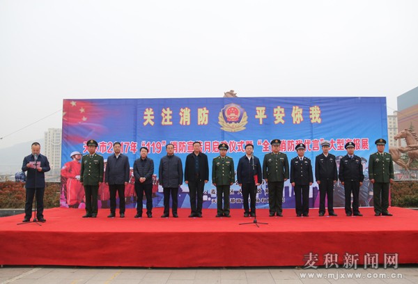 11月9日上午,天水市2017年“119”消防安全宣传月暨“全民消防我代言”大型海报展启动仪式在麦积区马跑泉市政广场举行。