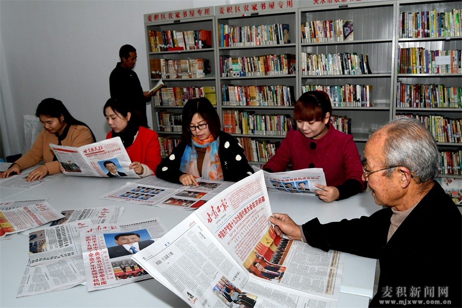 11月21日,麦积区马跑泉镇什字坪村省级“五星级农家书屋”室内,该村妇联正在组织妇女开起读书会,学习十九大精神。