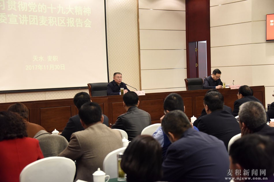 麦积区委书记张智明主持宣讲会,区四大组织在家领导贾应珍、成少平、杨续祥等参加了宣讲会。