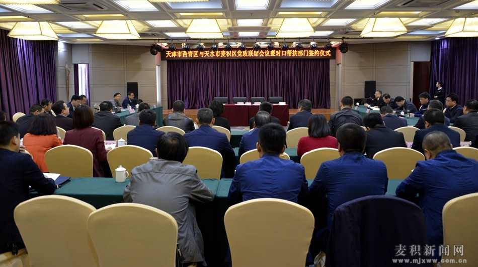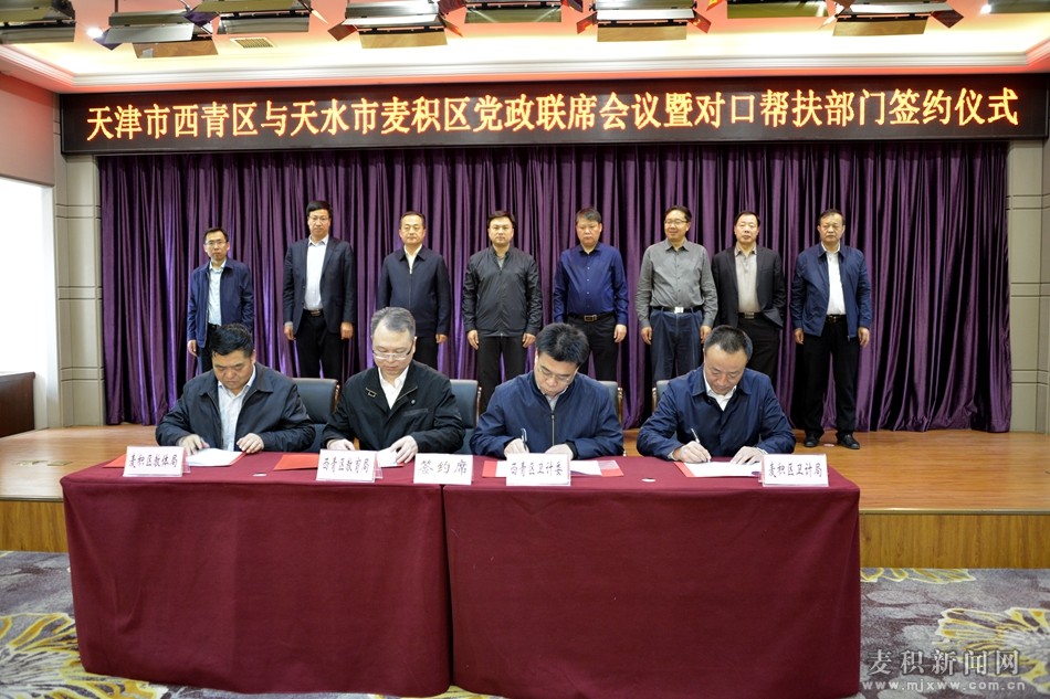 为了深入贯彻落实中央东西部扶贫协作座谈会议精神、天津市与甘肃省《东西部扶贫协作框架协议》、携手打赢脱贫攻坚战,4月4日上午,西青区与麦积区召开了党政联席会议,对接具体帮扶事宜,并举行对口帮扶部门签约仪式。