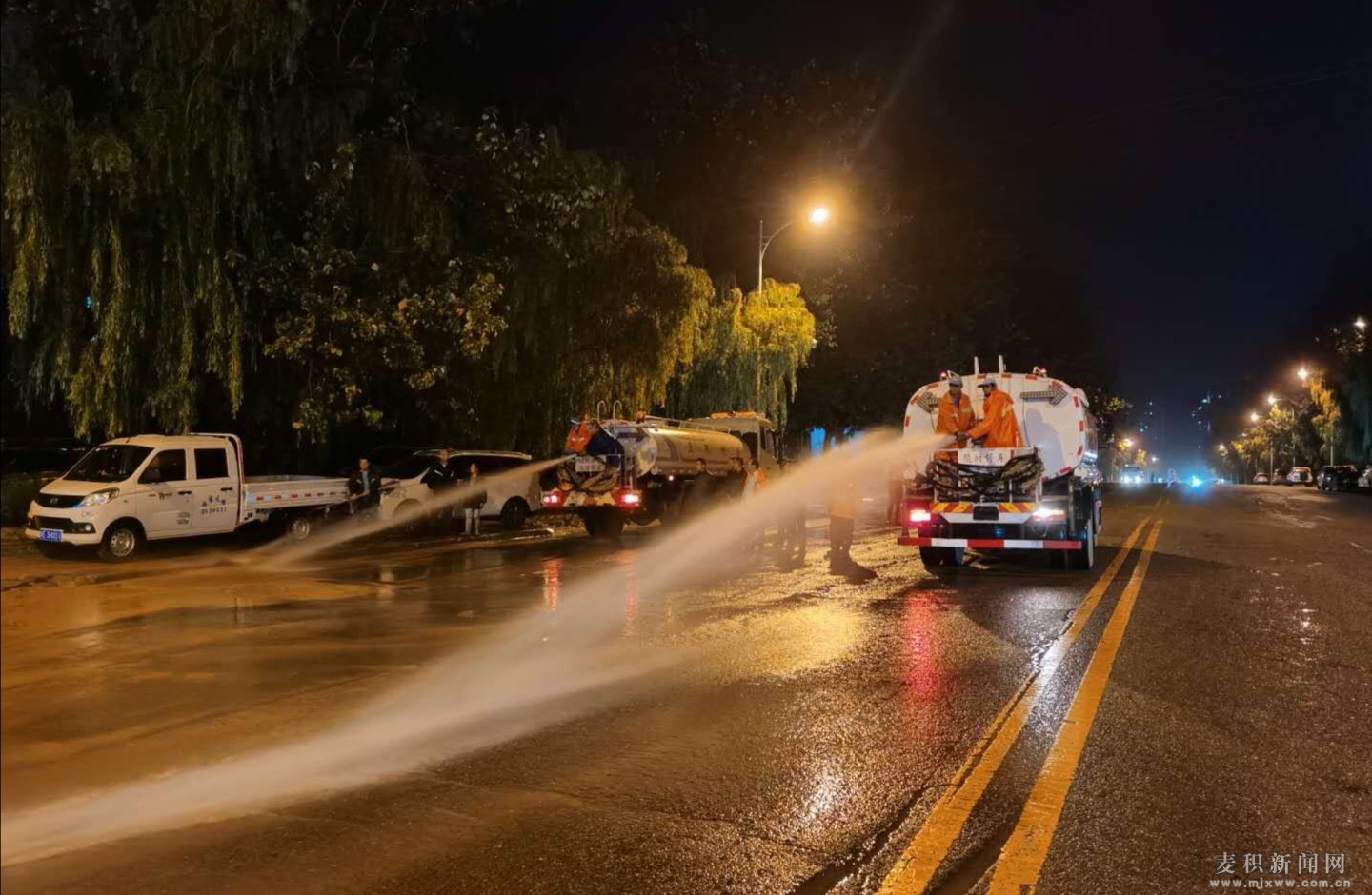 17日晚11点,在羲皇大道麦积区东段,麦积区环卫工作者连夜开展清淤工作。在作业过程中,为避免淤泥和垃圾被推入收水口造成再次堵塞,工作人员先将沿路淤泥和垃圾收集成堆,再装入三轮车运走。随后,4辆洒水车利用高压水枪对道路进行了首轮冲洗。最后,多名紧随其后的工作人员将冲刷路面的积水推入收水口,对路面进行第二次冲刷。