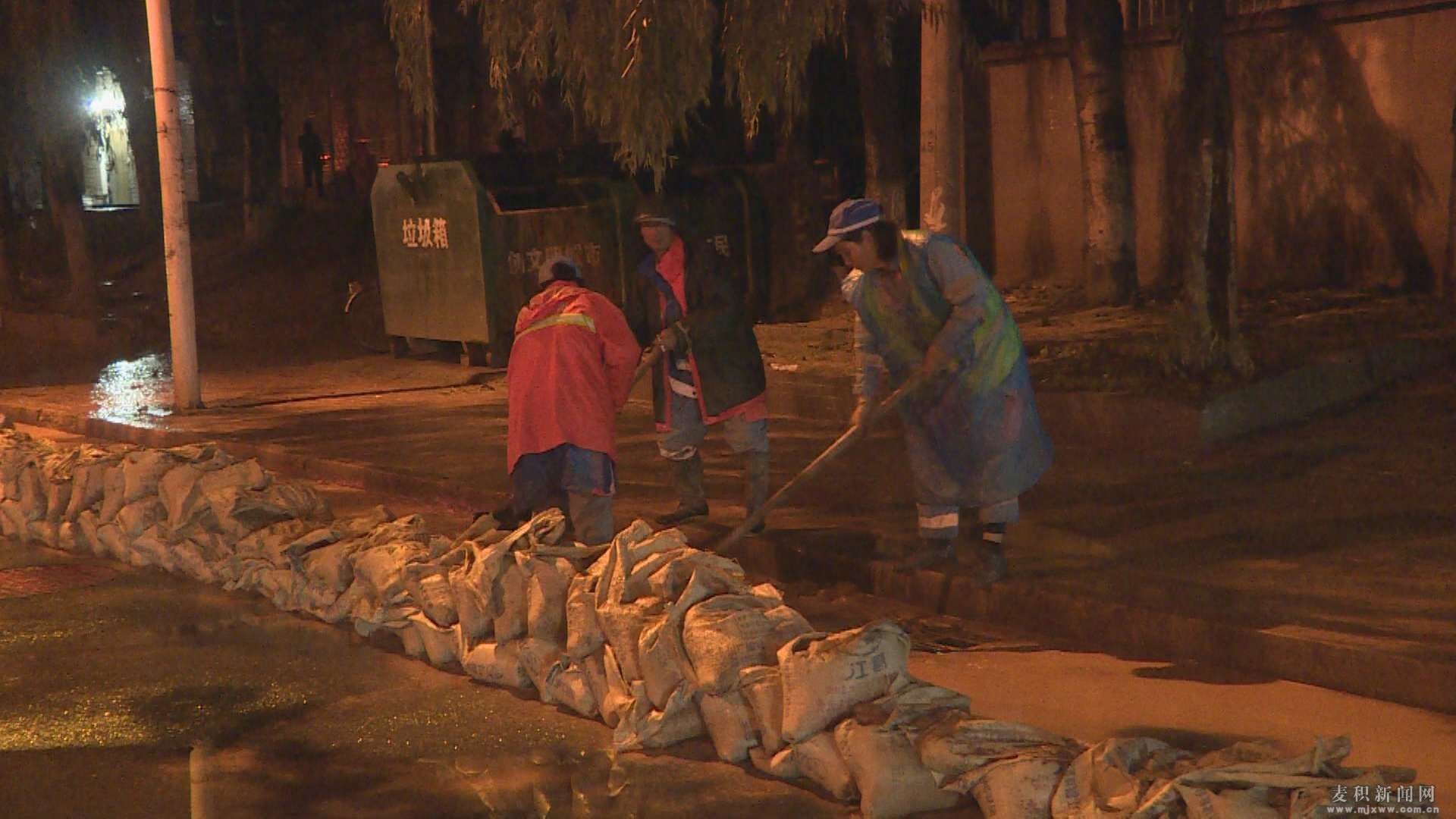 为全力保障城区环境卫生,麦积区城乡环境卫生治理服务中心从17日凌晨6点开始组织环卫工人携带扫帚、铁锹,冒雨对道羲皇大道麦积区东段涉及的红花咀村、慕滩村、大沟村、潘集寨村四个村庄路段堵塞下水道口进行清掏淤泥、清除堆积垃圾和落叶作业,加快排水速度,缓解路段排水压力。为尽快清理淤泥及积水,方便市民出行,还市民一个整洁有序的城市,清淤工作昼夜不停地进行着。