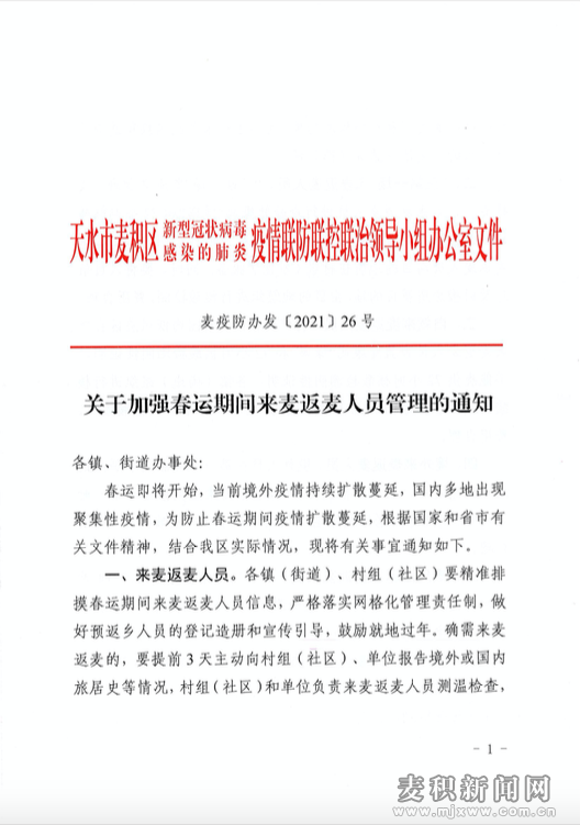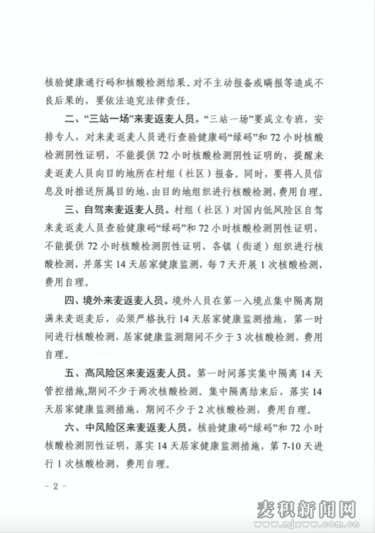 一、来麦返麦人员。各镇(街道)、村组(社区)要精准排摸春运期间来麦返麦人员信息,严格落实网格化管理责任制,做好预返乡人员的登记造册和宣传引导,鼓励就地过年。确需来麦返麦的,要提前3天主动向村组(社区)、单位报告境外或国内旅居史等情况,村组(社区)和单位负责来麦返麦人员测温检査,核验健康通行码和核酸检测结果。对不主动报备或瞒报等造成不良后果的,要依法追究法律责任。