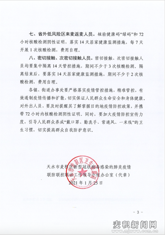 七、省外低风险区来麦返麦人员。核验健康码“绿码”和72小时核酸检测阴性证明,落实14天居家健康监测措施,每7天开展1次核酸检测,费用自理。