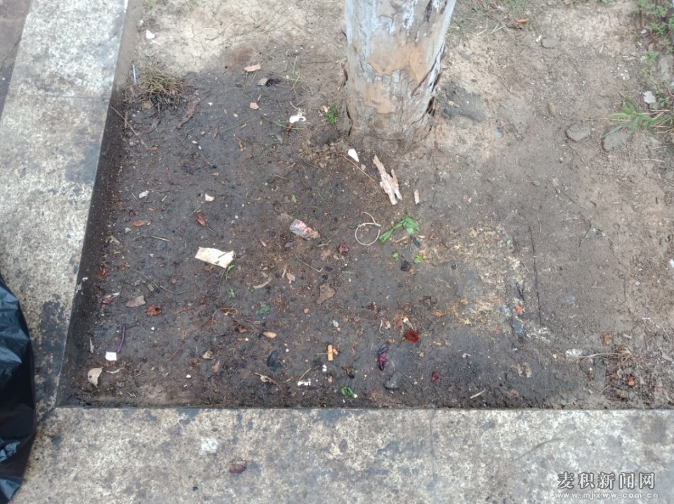 9月23日上午,麦积区志愿服务工作人员在马跑泉西路一带进行卫生清洁过程中发现,湘水阁土菜馆、胖子铁板烧等餐饮店门前不远处的行道树下布满了餐饮油污,土壤因油渍变成了黑褐色。树旁还乱丢弃一黑色垃圾袋。黑色垃圾袋中装满了餐饮垃圾,垃圾袋周围的地面残留着星星点点的食物残渣。