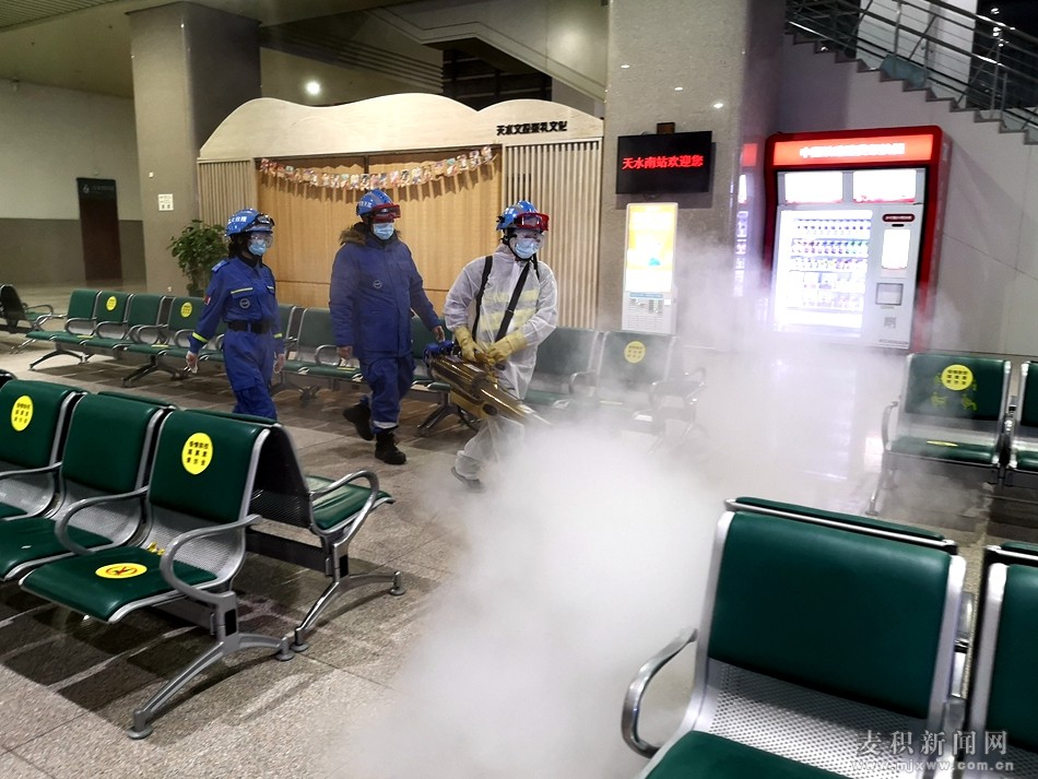 天水蓝天救援队任务组组长李鑫说:“疫情就是命令,防控就是责任。我们这些志愿者,充分发挥自己的专业能力,运用专业技术,在天水高铁南站开展防疫消杀,守护天水市民的生命安全防线,尽志愿者的一份力量。”