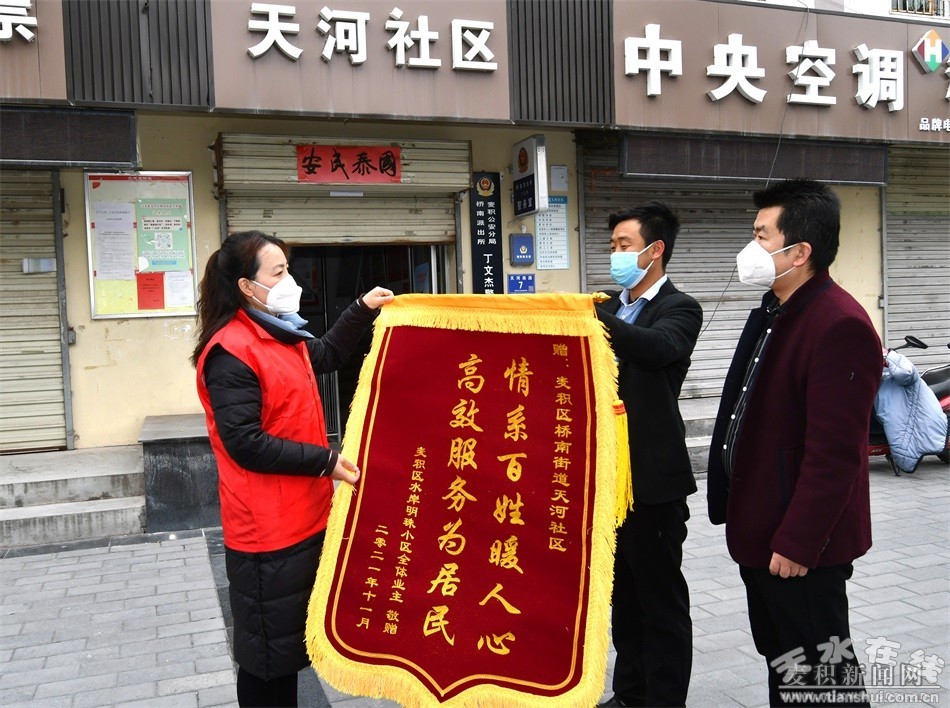 麦积区融媒体中心讯(特约记者 窦耀辉)11月18日,麦积区水岸明珠小区业主委员会代表将一面写有“情系百姓暖人心 高效服务为居民”的锦旗送到了桥南街道天河社区,以表达该小区400多户居民对社区工作者在疫情期间对他们所付出的无微不至的关怀和服务。