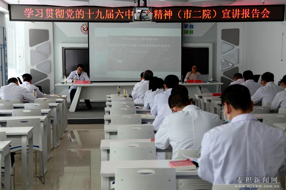 市二院 12月21日,天水市第二人民医院举办学习宣传贯彻党的十九届六中全会精神宣讲报告会,邀请麦积区委讲师团成员、区委党校讲师高利娟对党的十九届六中全会精神进行解读。党委委员、班子成员和各支部书记、党建办、党政办负责人共40余人参加报告会。