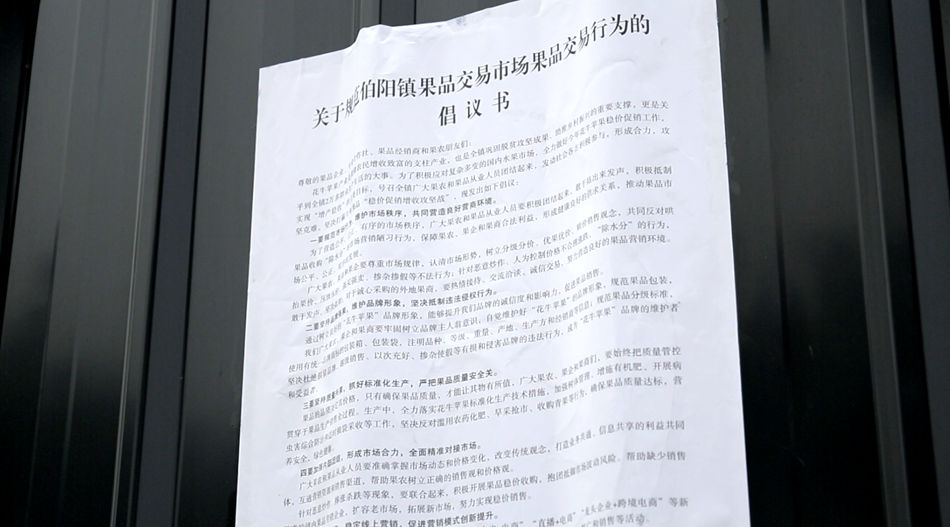 “我们还积极引导各行业部门广泛参与,联合农业农村局果业发展中心、镇市场监管所及伯阳果品协会,制定并印发了《关于规范伯阳镇果品交易市场果品交易行为的倡议书》6000余份,倡议广大果农、果品收售代办规范果品的分级标准,热情接待外地果商,诚信交易。坚决抵制压级压价、掺杂掺假等行为,营造良好的果品营销环境,倡导辖区果农坚持‘质量兴果,严把果品质量安全关’,推广新型经营模式,全面稳定我镇果品交易市场,促进产业健康发展,果农增收致富。”伯阳镇镇长杨宏学如是说。