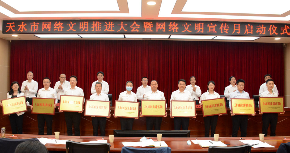 会议宣读了市委书记、市委网络安全和信息化委员会主任冯文戈关于切实加强网络文明建设工作的批示,市文明办、市教育局、团市委、人行天水市中心支行围绕“网络文明建设”主题做了交流发言,宣读了2022-2023年度天水市网络文明宣传大使名单,网络文明宣传志愿者代表宣读了《共建天水网络文明倡议书》,宣读了《关于命名一批天水市网民素养教育基地的通知》并授牌。