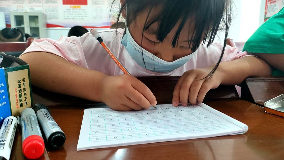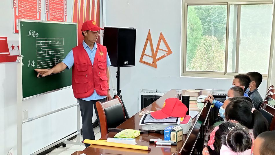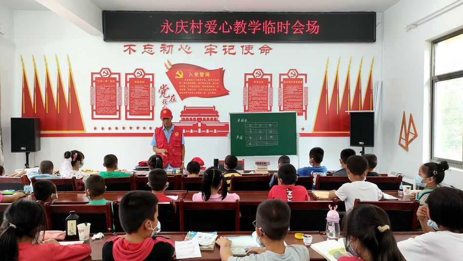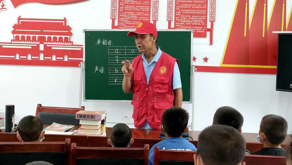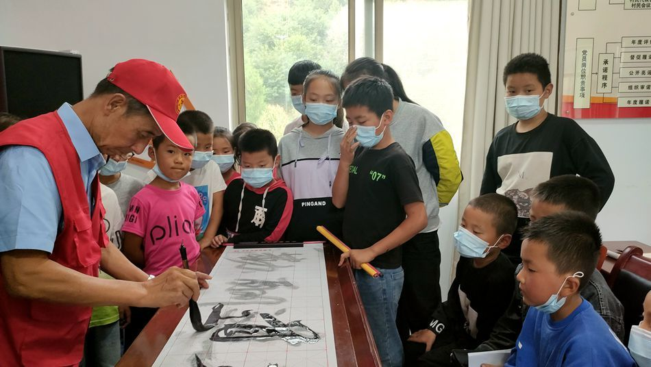 这是永庆村爱心教学临时会场的一节书法课。执教41年的米四保重新回到了教书一线。41年的教学生涯中,米四保是耕耘者;退休6年后,他穿上红马甲,以志愿者的身份重回讲台,在暑期为村里的孩子补习功课。“我刚开始上课的时候特别紧张,担心老师会很严厉。后来我跟着米老师学了很多知识,觉得米老师是非常严肃又认真的一个人。”正在读小学的仙嘉惠这样评价米老师。