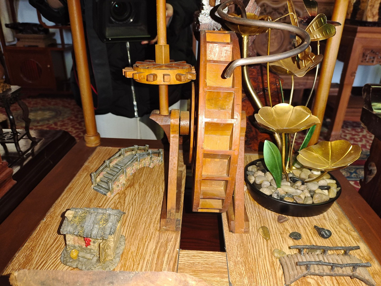 木雕从一块原木到最终作品呈现,每道工序都考验着创作者的构思、经验和耐心。在张德义的展厅中,有一座精巧的水磨微雕模型。张德义对这个作品有着深厚的感情,与他而言,这不仅是父亲教他的技艺,也是中国古代劳动人民的智慧结晶,更是中国传统榫卯结构的精巧展现,在近乎失传的当下,更应该传承下去。
