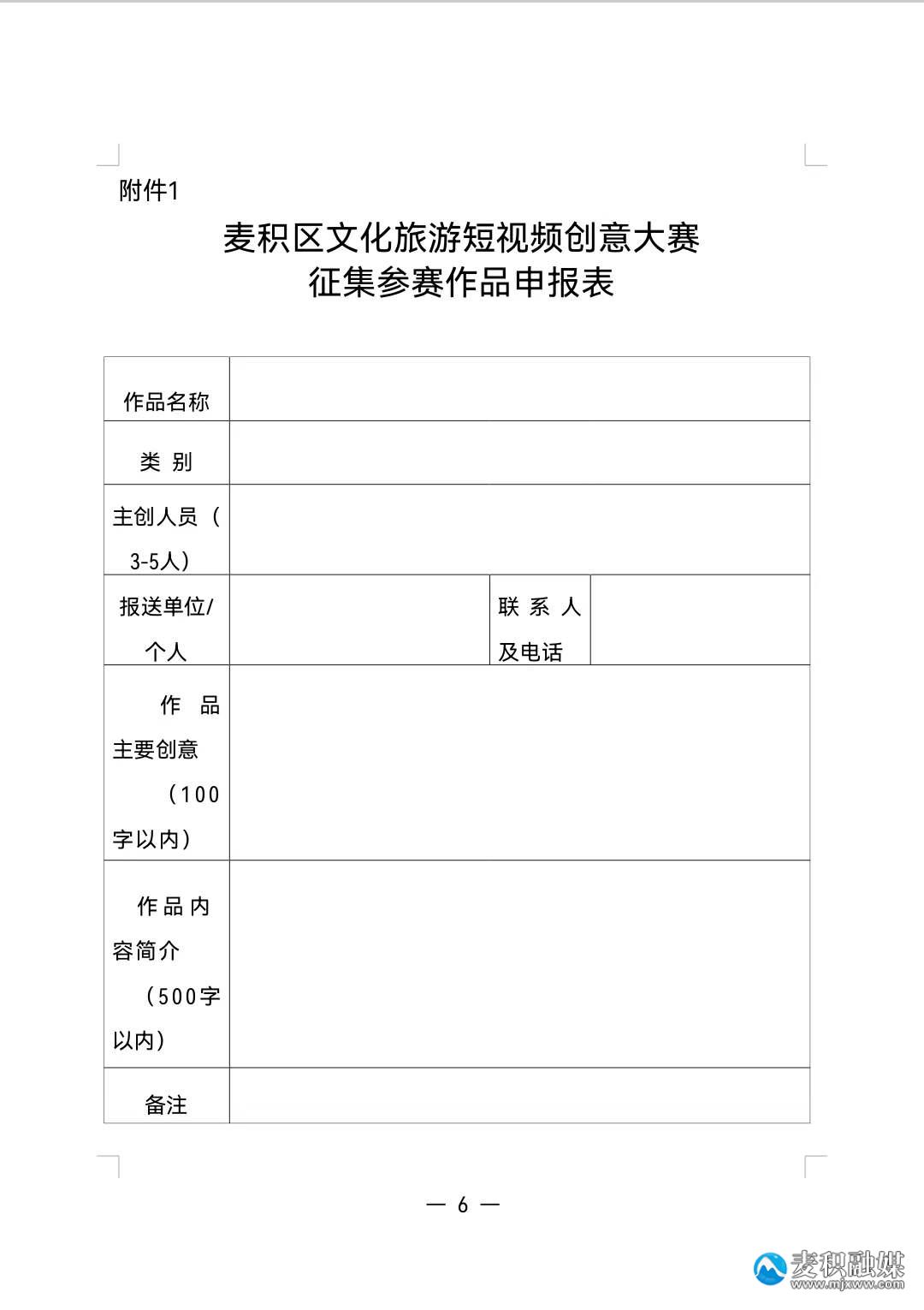 附件:1.麦积区文化旅游短视频创意大赛参赛作品申报表