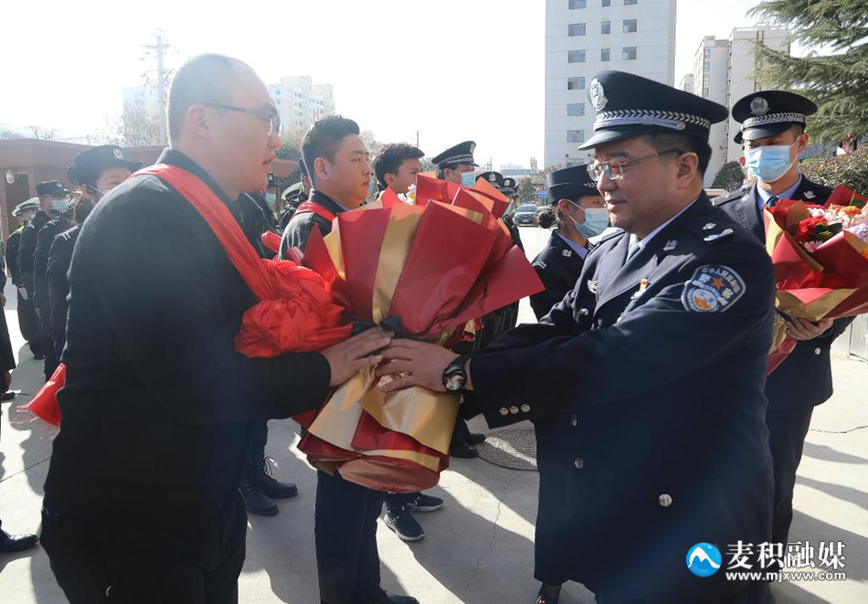 欢迎仪式上,郭庆祥与凯旋而归的专案民警一一握手,并送上鲜花,对麦积公安分局在命案积案攻坚中取得的重大战果表示热烈祝贺,向全体参战同志致以亲切慰问。