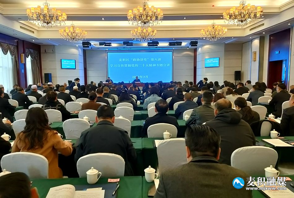 麦积区融媒体中心讯(记者 宋倩倩)3月15日,麦积区“政协讲堂”第八讲开讲,专题宣讲党的二十大精神。区政协党组书记、主席高志强主持讲座,区政协副主席胡桂琳、高国明、兰春梅、张建凤、温绪祖及区政协全体委员、机关干部职工聆听讲座。