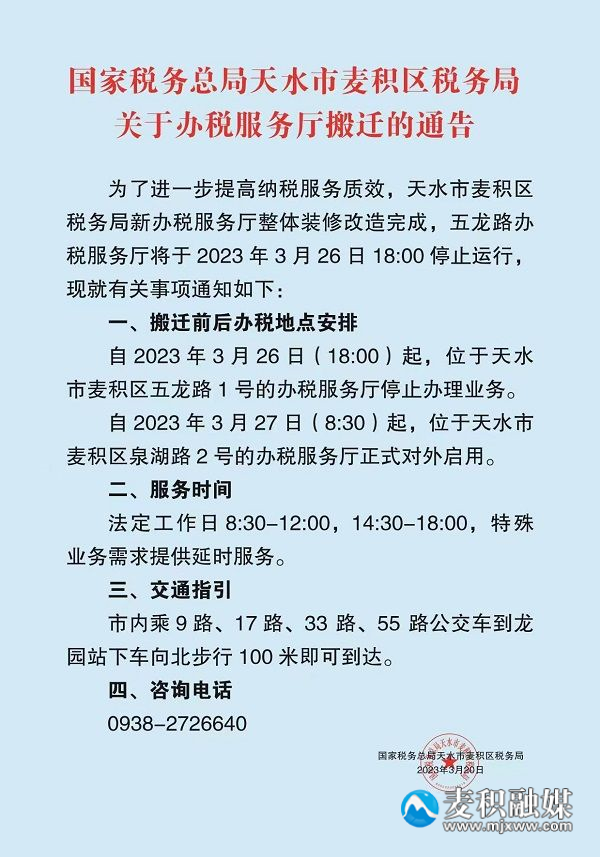 为了进一步提高纳税服务质效,天水市麦积区税务局新办税服务厅整体装修改造完成,五龙路办税服务厅将于2023年3月26日18:00停止运行,现就有关事项通知如下: