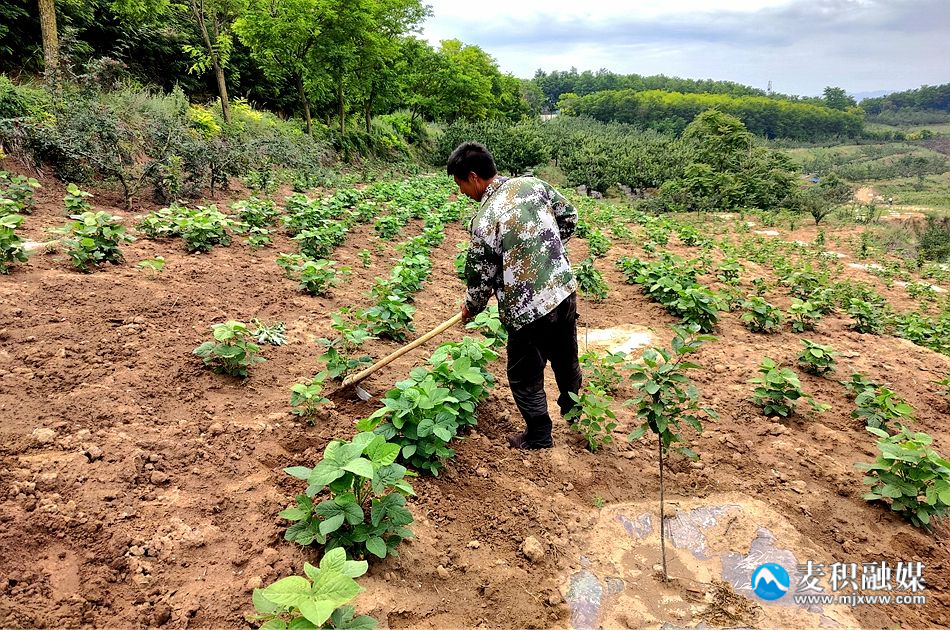 麦积区融媒体中心讯(记者 白梨 张丹 实习记者 徐沐阳)仲夏时节,在麦积区花牛镇九裕村的老旧果园改造地里,村民刘岁全趁着清晨微凉的天气,给新种植的苹果树苗下套种的黄豆苗锄草松土。