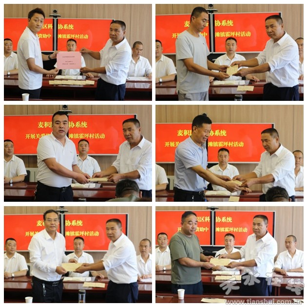 中滩镇霍坪村是区科协帮扶村。近年来,霍坪村在区科协的全力扶持下,在镇党委、政府的正确领导下,村“两委”带领全体村民凝心聚力、积极作为,坚持抓重点、破难点,补短板、夯基础,乡村振兴各项工作持续健康发展,2020年实现了整村脱贫。由于该村地处北部干旱山区,自然条件差,经济基础薄弱,防返贫风险依然存在。为了进一步改善基础设施,增加村集体积累,巩固脱贫成果,践行企业社会责任担当,激发全体村民致富热情,麦积区科协组织农技协开展了关爱资助活动。活动仪式上,区农技协会以组织和个人名义现场进行了资金捐赠,其中天水泽明眼科医院在资金捐助的同时,为霍坪村近视眼、老花眼患者再捐增眼镜400副,价值26000元。