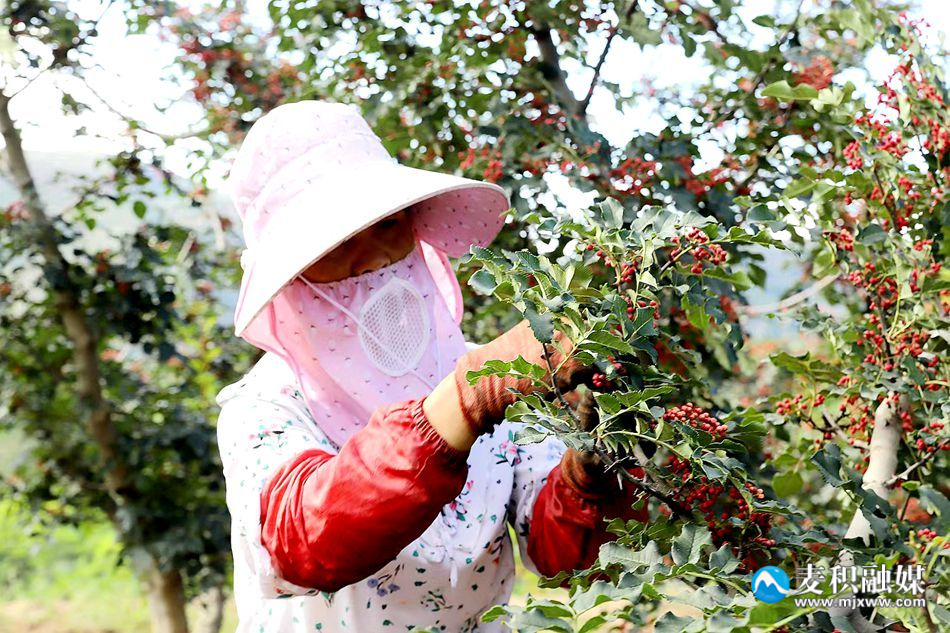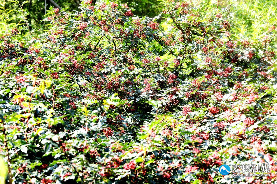 红色的花椒布满了大街小巷和村子的院落、空闲的场地, 在火红的太阳下散发出诱人的独特香味。漫山遍野的花椒地里,不分男女老幼,顶着烈日采摘花椒,汗水和着欢声笑语,构成了一幅幅独特的劳动场景。