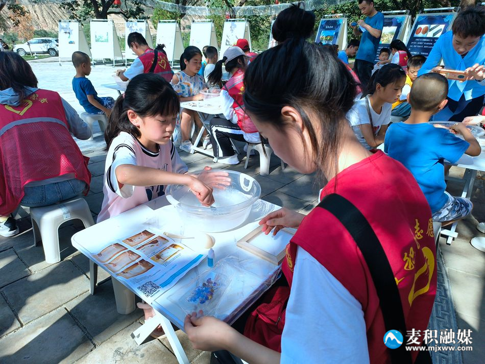 在柿柿如意园,研学团成员和参加活动的留守儿童一起动手体验了我国四大发明之一——造纸术。大学生和小朋友两两一组,在清水中加入纸浆,经过搅拌、加入造纸胶、抄纸、装饰花草、二次浇浆、晾晒等一系列简单有趣的操作,成功复刻了造纸术。几名研学团成员还换上汉服,向孩子们教授了手语操《国家》,在欢声笑语中共同度过了一段难忘的时光。