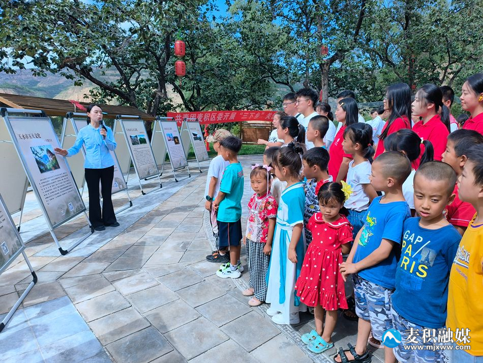 “五千多年前出现的伏羲文化是中华文明的源头……”下午三点,研学团走进麦积区渭南镇张新村柿柿如意园,在区博物馆工作人员的带领下,大家通过阅览展板、聆听讲解,深入了解伏羲文化、农耕文化、民俗文化、麦积历史文物等,感受麦积悠久的历史文化魅力。