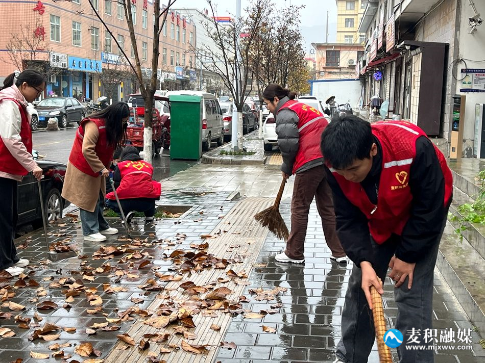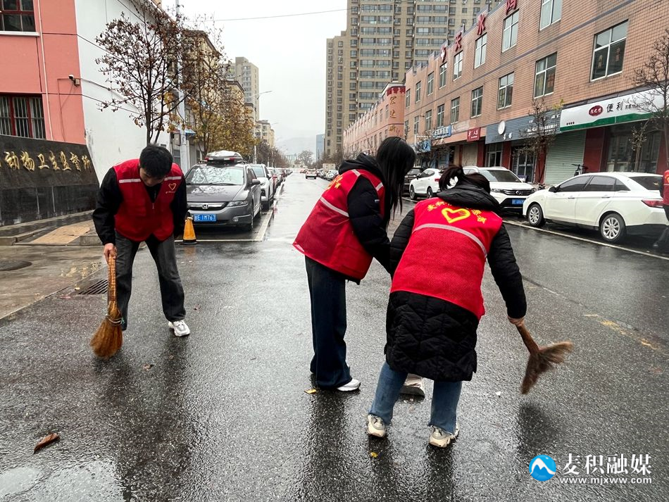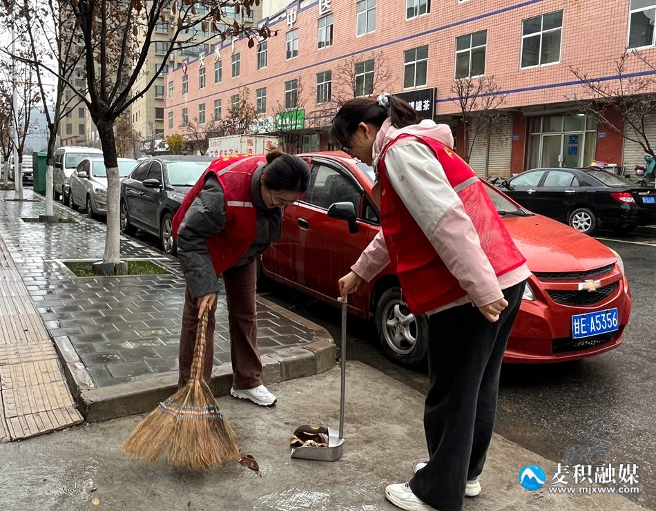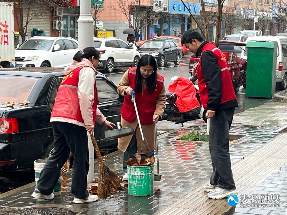 近日,记者在麦积区新建巷北段看到,团区委的青年干部及志愿者们身穿统一的“红马甲”,手持扫帚、簸箕、夹子在濛濛细雨中来回穿梭在街头巷尾。他们有的在清扫街道垃圾,有的负责捡拾烟头,还有的将停在路边的自行车规范摆放到指定位置。青年志愿者们以实际行动投身到创城一线工作中,使包抓片区环境有了明显改观。