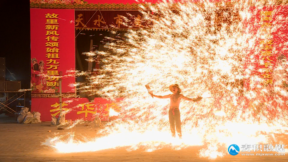 随着夜幕降临,天水裴龙打铁花艺术团开始了表演。表演者点燃了滚烫的铁水,将其抛向空中,随即击打,使铁花如烟花般绽放,点亮了整个夜空。与此同时,火壶民俗艺术表演也同步展开,火焰与舞蹈交相辉映,将火壶舞蹈与节日氛围完美结合,形成了一幅美丽的传统文化画卷。现场观众纷纷拿出手机,拍照记录。