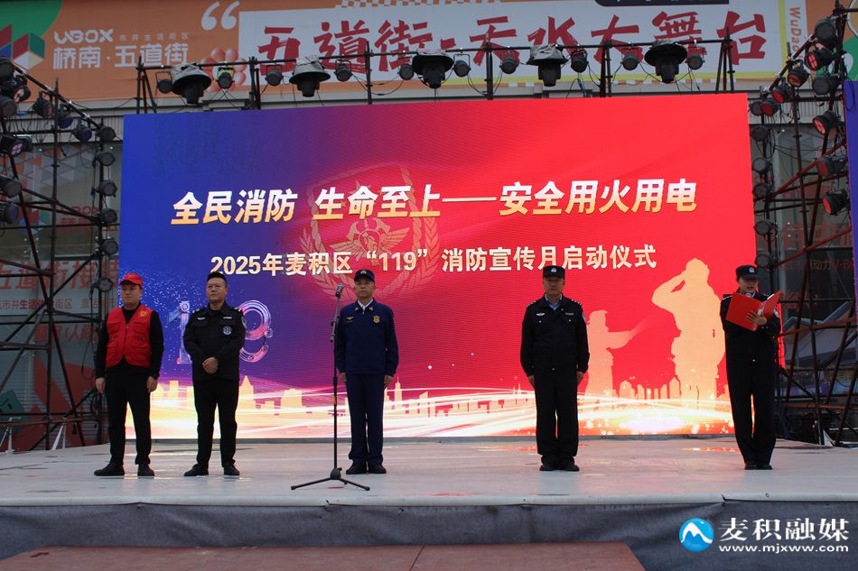 麦积区融媒体中心讯(记者陶宇莫哲涛)今年11月9日是第34个全国消防日,11月为全国消防宣传月,今年的消防宣传月主题为“全民消防、生命至上——安全用火用电”。为全面提升全民消防安全意识与社会防控能力,近日,麦积区2025年“119”消防宣传月启动仪式暨警消联合安全宣传活动在桥南建材市场五道街举行。
