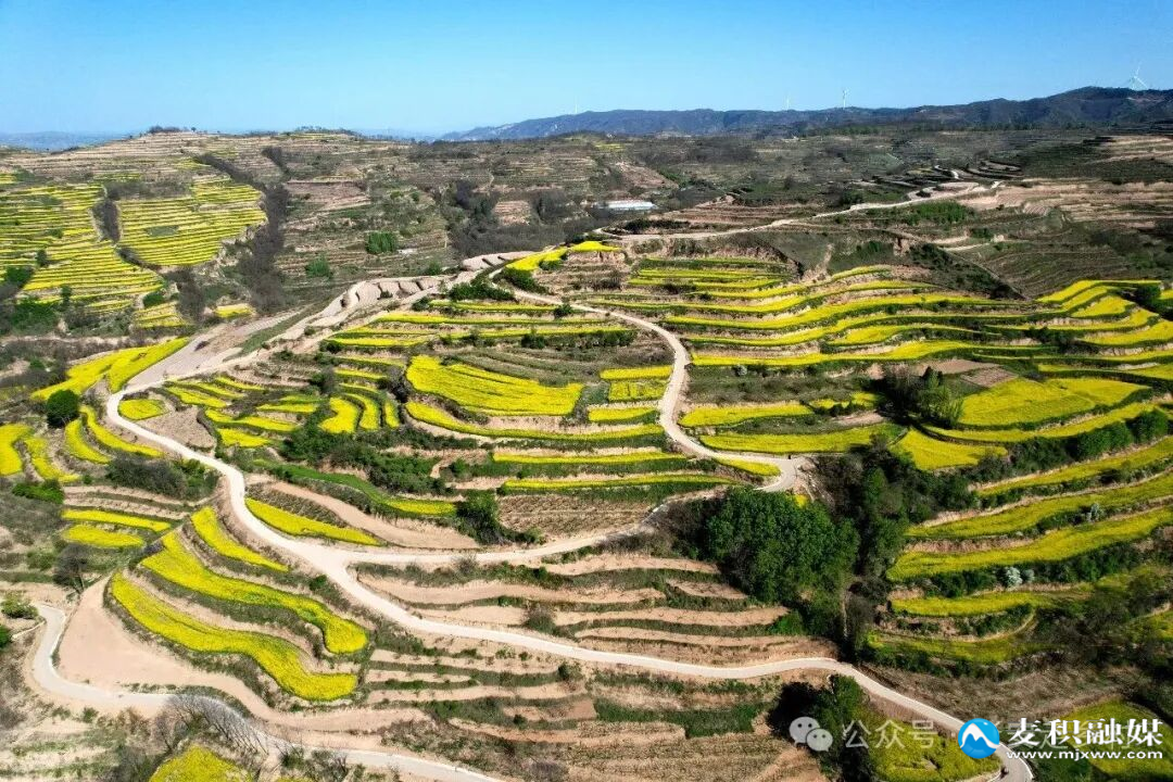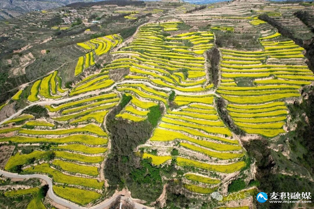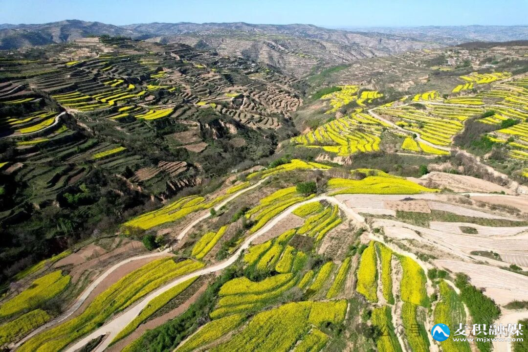 眼下,当地依托粮油轮作模式,去年深秋在高标准农田内规模化种植的优质冬油菜,正值最美盛花期,迎来最佳观赏时节。极目远眺,金黄花海顺着黄土梯田层层叠叠、绵延舒展;高空俯瞰,田垄线条流畅、层次错落,蓝天、梯田、花海相映成趣,兼具诗意田园的生态之美与现代农业的蓬勃质感。