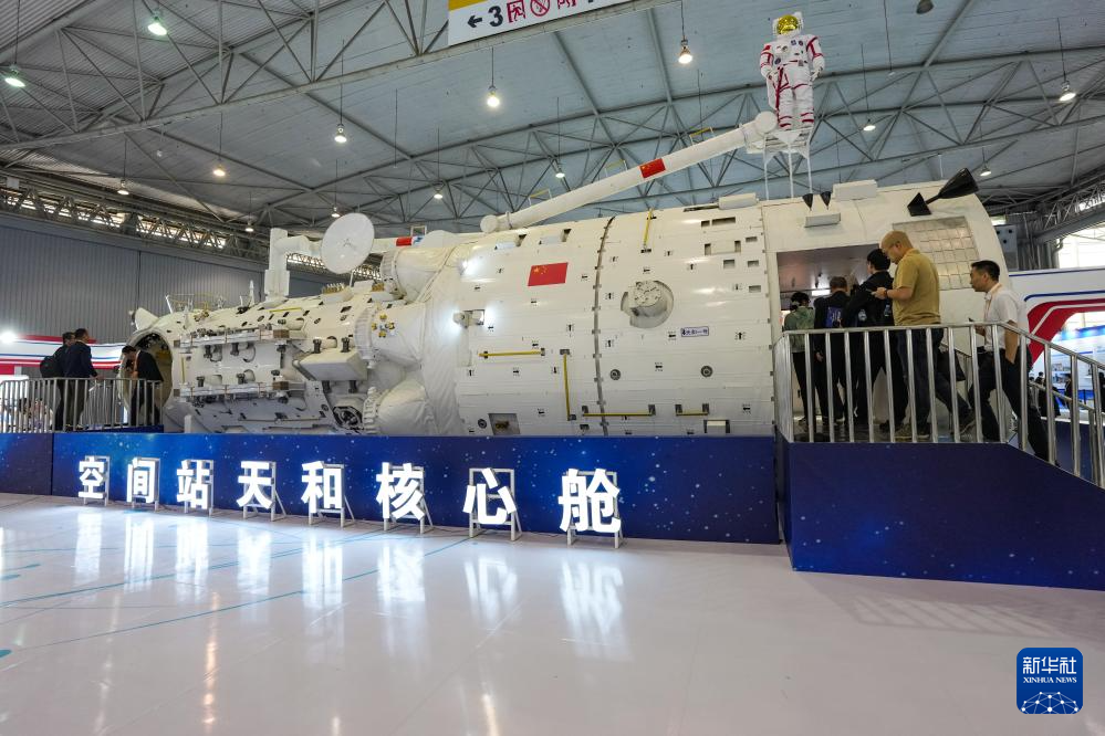 4月24日,参会嘉宾在航天科普展览上参观空间站天和核心舱。