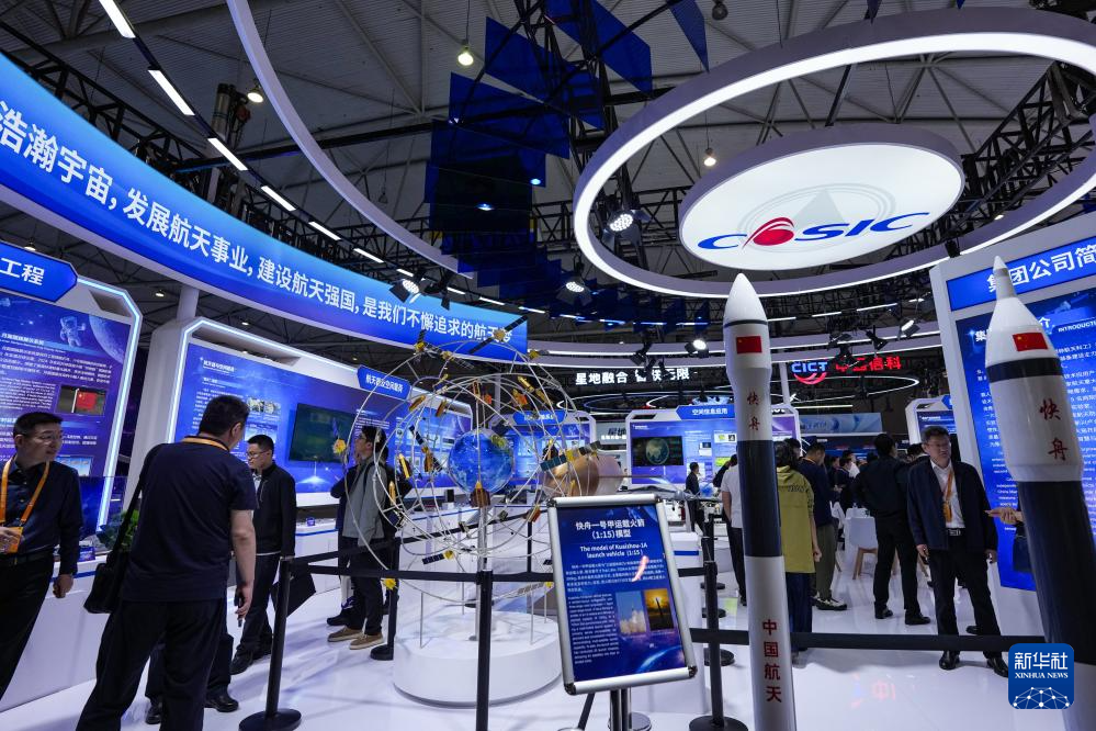 4月24日,参会嘉宾在航天科普展览上观展。