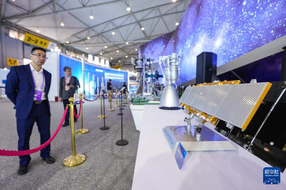 4月24日,参会嘉宾在航天科普展览四川航天展区参观卫星展品。