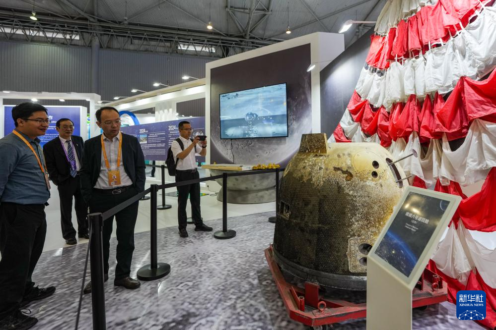 4月24日,参会嘉宾在航天科普展览上参观嫦娥六号返回舱。