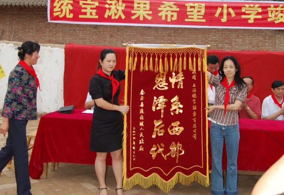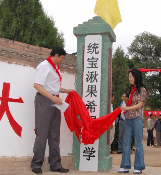 (上海统宝船务有限公司法人代表解丽君与天水市副市长赵卫东为统宝湫果希望小学揭牌)